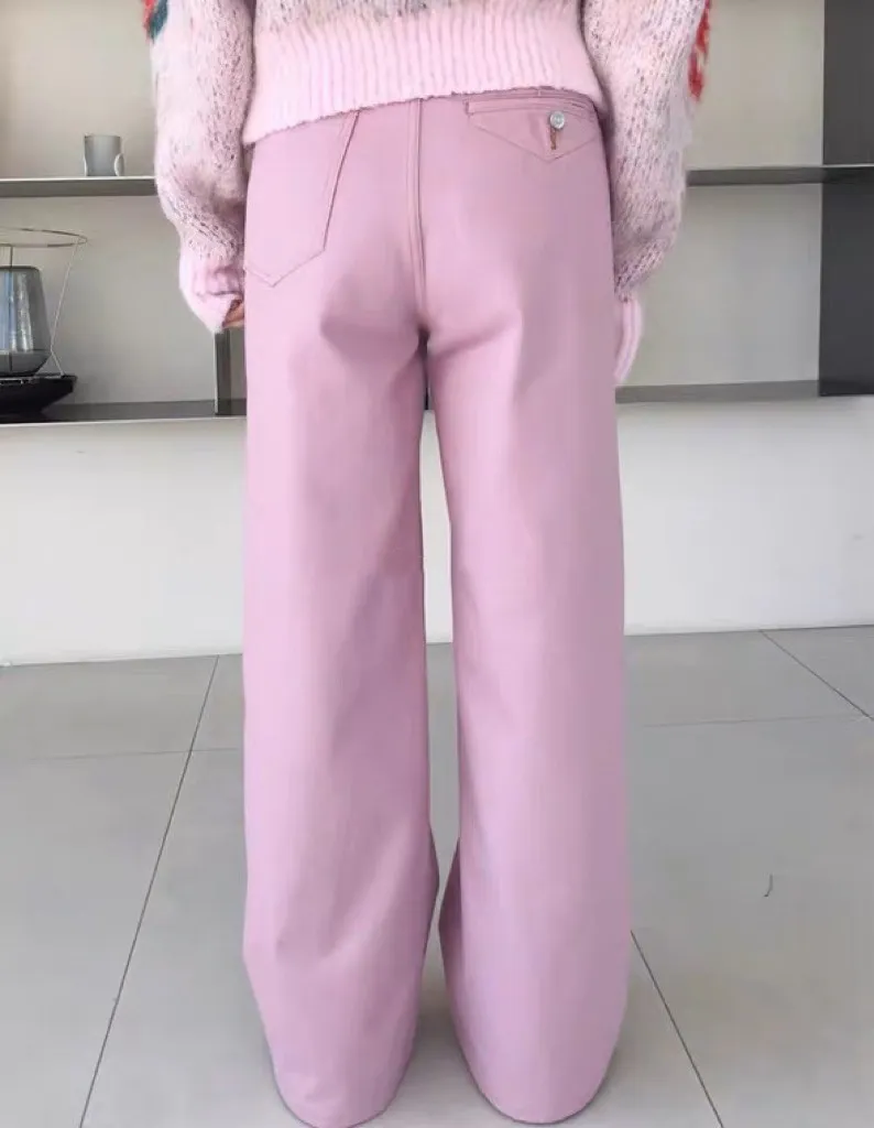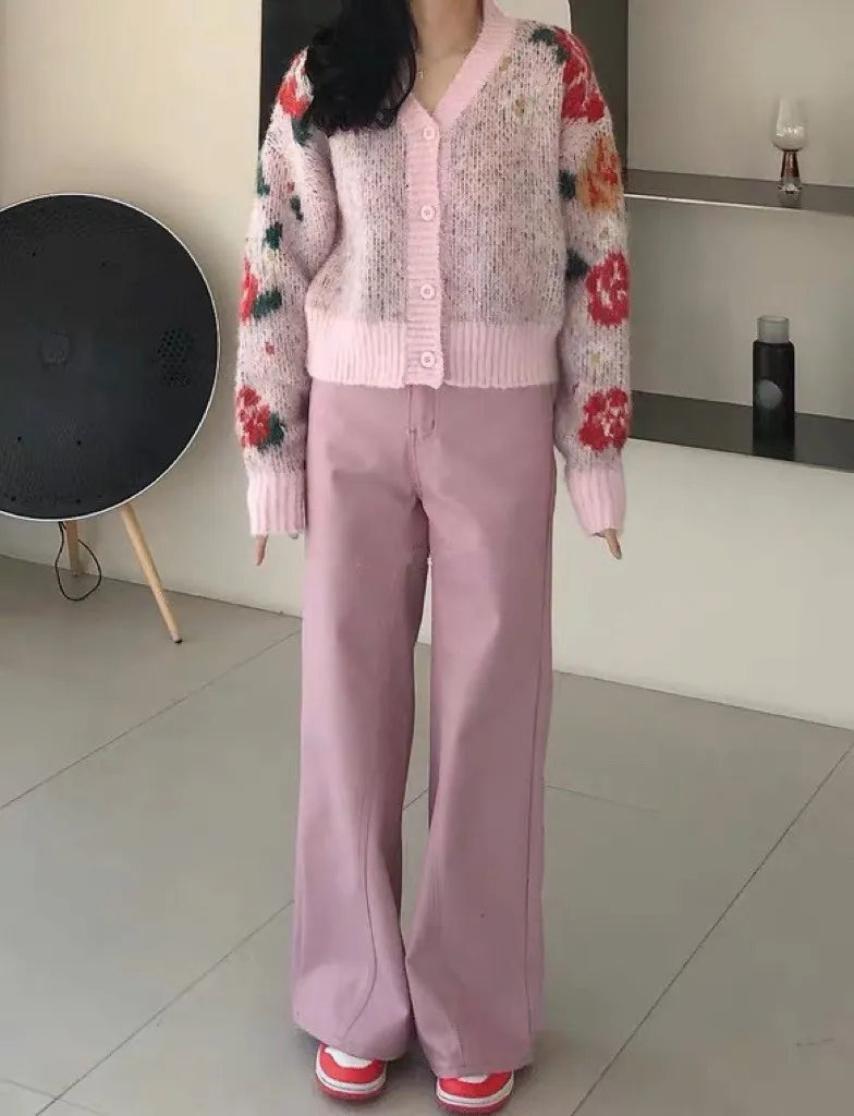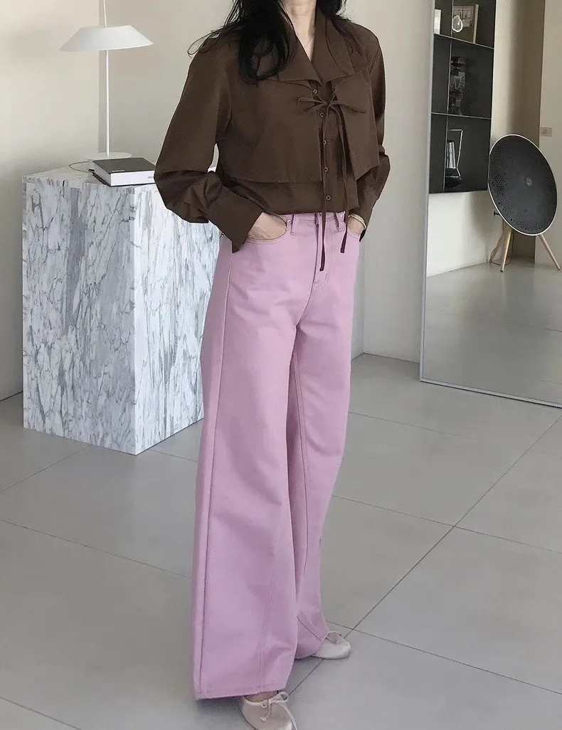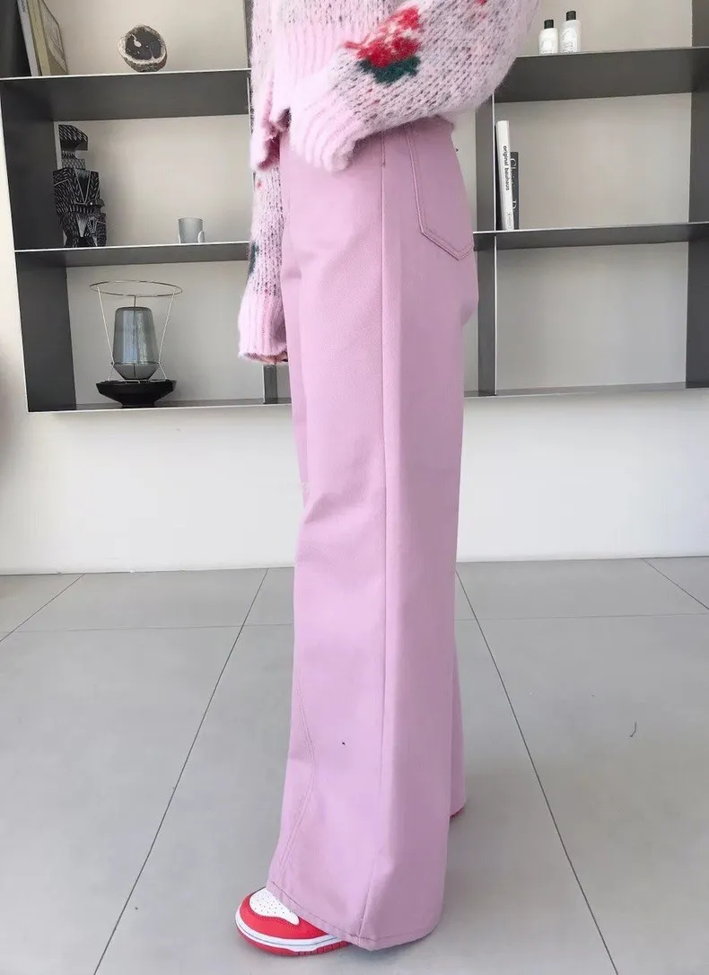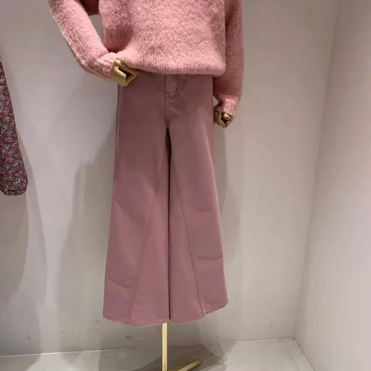 這下擺寬剪裁的粉色牛仔褲單穿就很出挑~
